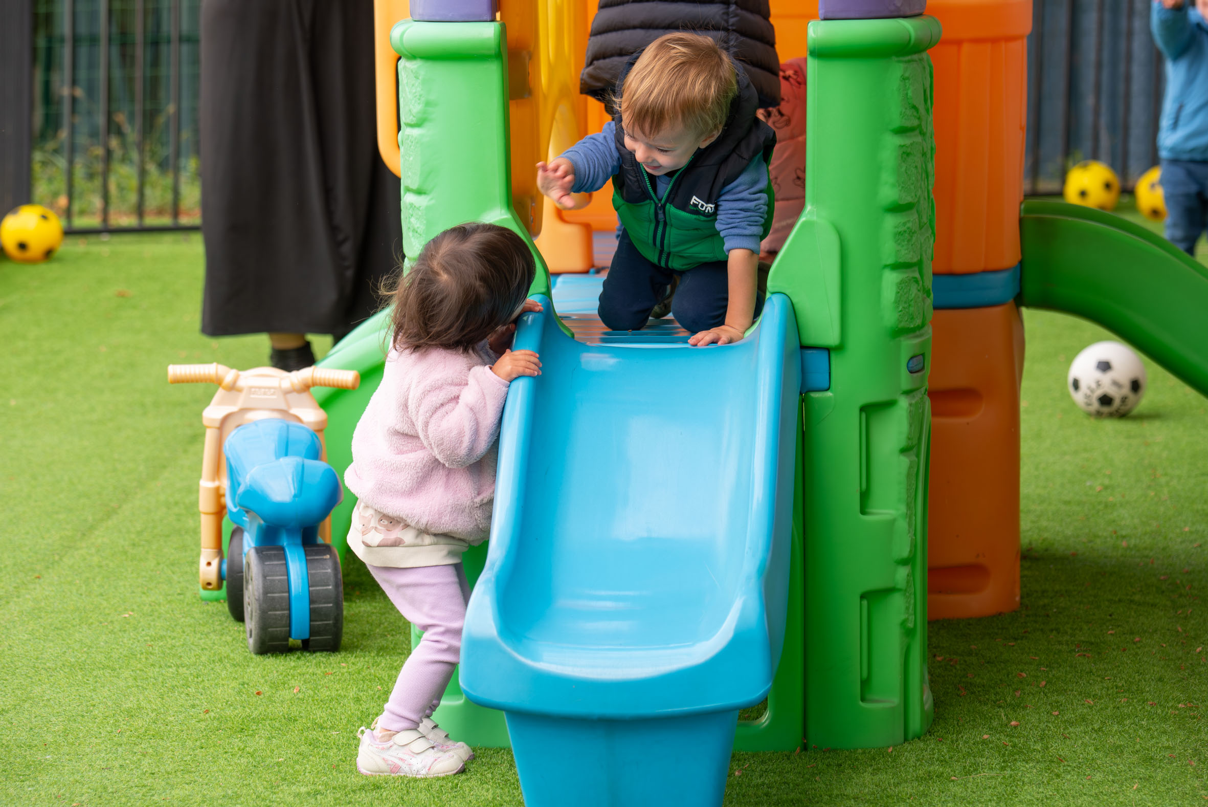 A key element of our engaging environment is the cheery and well-equipped back garden. This space allows children to enjoy supervised outdoor play, where they can develop gross motor skills and socialize while using facilities like tricycles, swings, a slide, and more.